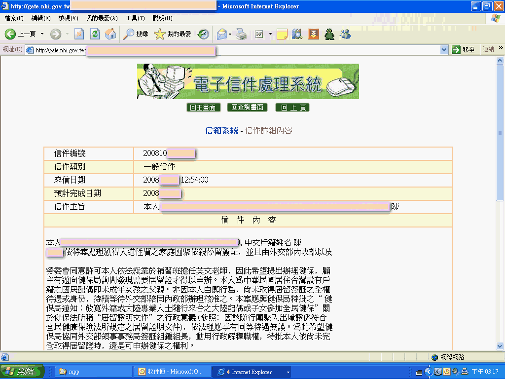 以上不是重點,重點在後面。我進了健保局的網站後,當然我就點了民眾意見信箱->民眾發信..,資料寫了寫,點了完成送出...