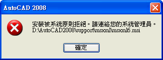 這是因為Autocad 2008光碟內的安裝程式版本問題請至微軟下載msxml6.msi繁體中文版本,下載後將將原光碟片